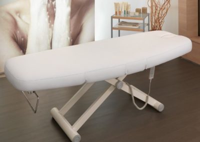 Avantages pour le client : table de soins avec accès facile pour clients blessés, obèses, personnes âgées confort maximum garanti par un généreux rembourrage et des mouvements du dossier et des jambes assistés par un système électrique.